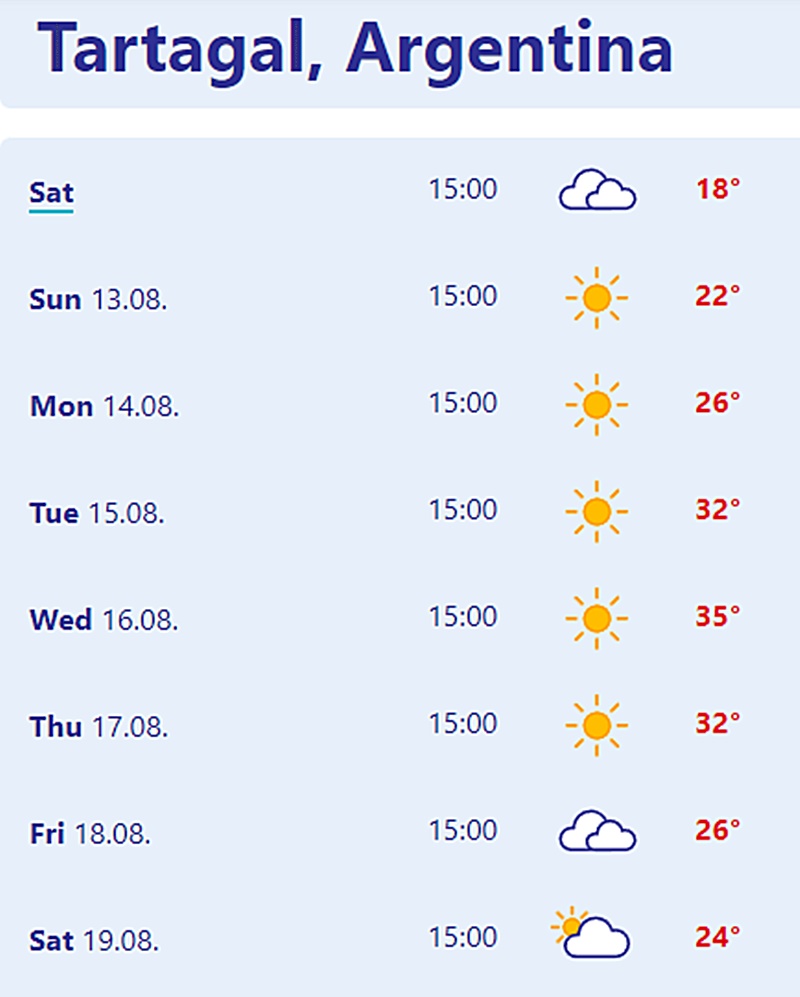 El informe del SMN destaca que el fin de semana, que comenzó con bajas temperaturas producto del ingreso de aire polar, llevará a registros estimados de 15 a 20 grados para el sábado 12 para la región este de Salta. Para la capital provincial se estima que las marcas ronden los 16 y 17 grados, siguiendo la tendencia de frio pero no demasiado intenso como tampoco al caso de vientos, acompañado por cielo entre algo y parcialmente nublado, tanto el noroeste como el noreste.