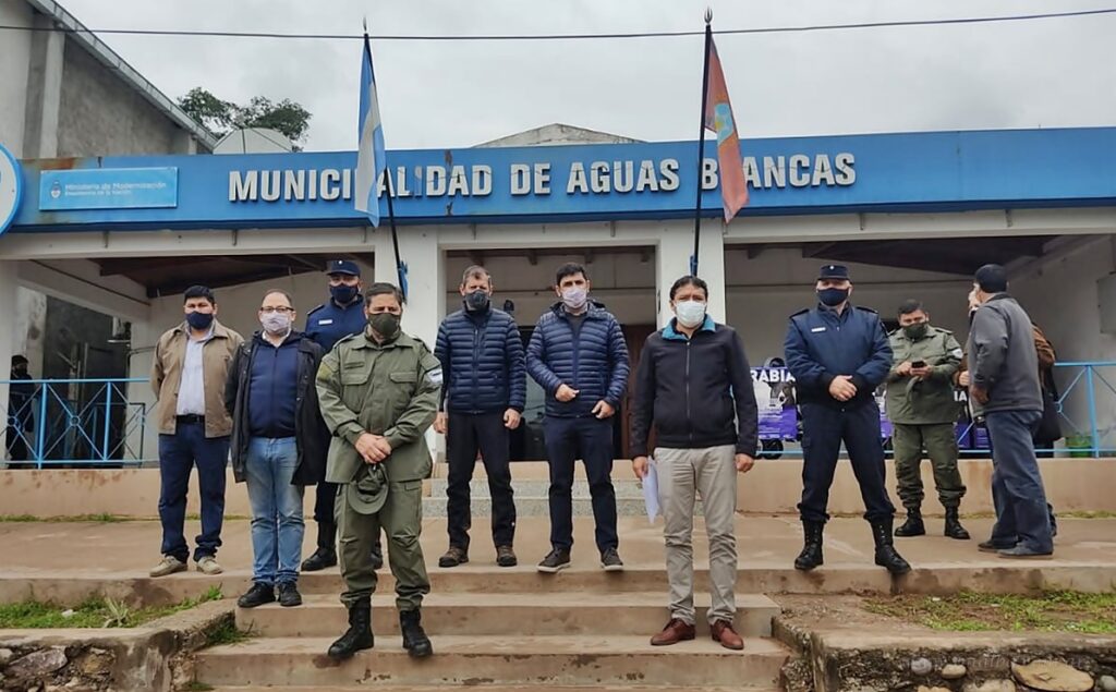 Mismo trabajo se llevó a cabo en Aguas Blancas; departamento Orán; encabezado también por el ministro de Seguridad de Salta, quien recorrió la zona con funcionarios de la subsecretaría de Intervención Federal del Ministerio de Seguridad de la Nación, efectuando una reunión logística en la que participaron también autoridades policiales, de Gendarmería Nacional y el intendente local.