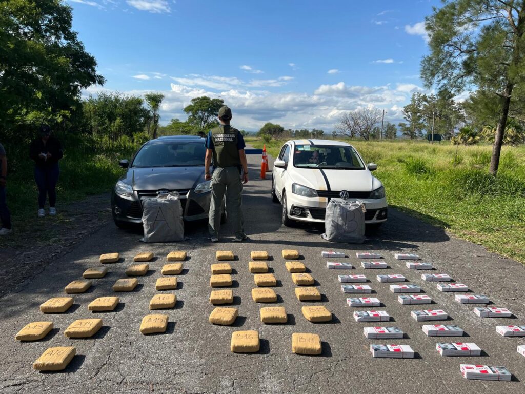 Durante el procedimiento, se secuestraron 33 paquetes de “cannabis sativa” con un peso total de 35 kilos 328 gramos, además de 250 paquetes de cigarrillos, dinero en efectivo por un monto de 165.800 pesos argentinos, dos teléfonos celulares, tres tarjetas SIM y los dos vehículos involucrados.