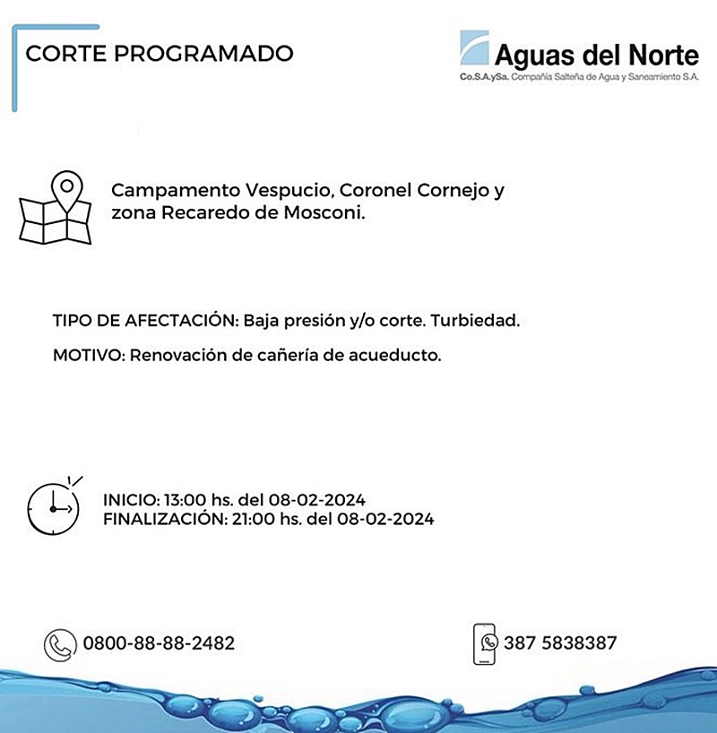 Para este jueves 8 de febrero, residentes de Campamento Vespucio, zona de barrio Recaredo en Mosconi y Coronel Cornejo tendrán corte programado de agua debido a trabajos de renovación en la cañería del acueducto, se informó. La afectación comenzará en horas del mediodía y se normalizará en las primeras horas de la noche.