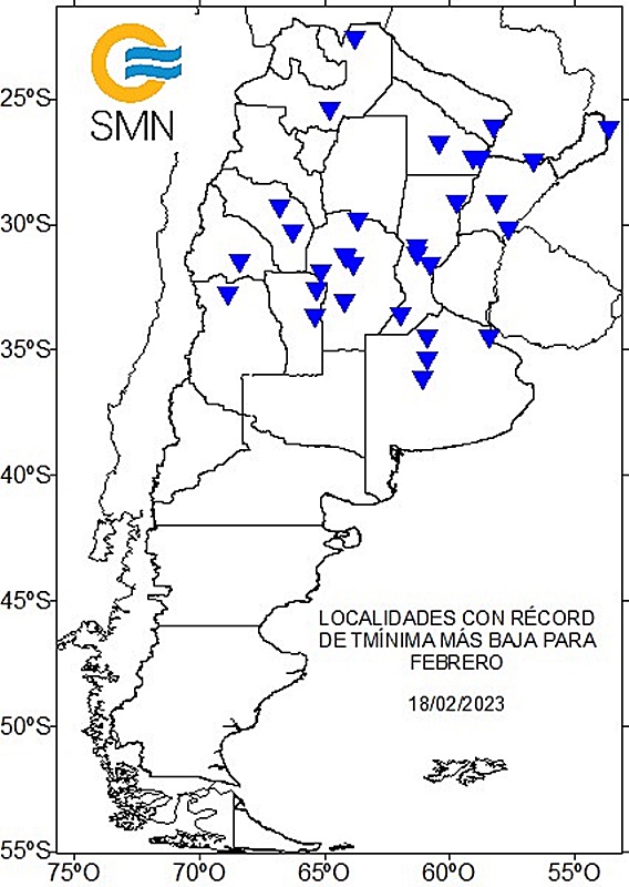 En la región central del país se produjo una helada sorprendente e inesperada para un 18 de febrero, mientras que el Servicio Meteorológico Nacional confirmó más de 30 nuevos récords de temperatura mínimas en ciudades que tuvieron su mañana más fría para el mes desde que se tienen registros. Para Tartagal (Salta) la marca histórica era de 11.4 grados, anotada el 20 de febrero de 2003; mientras que este sábado la temperatura fue de tres grados más baja, descendiendo a los 9.4 grados.