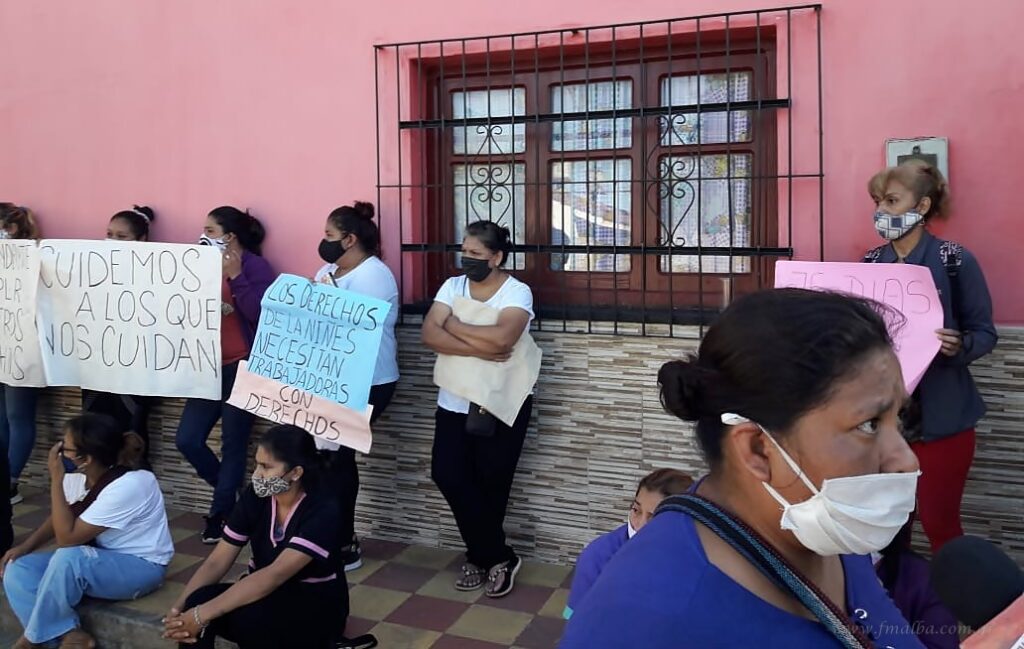 Un grupo de 22 mujeres del sector de cuidado maternal del Hogar de Niños “Padre Gualterio Ansaldi” inició esta mañana con manifestación pacífica en las afueras de la institución, en reclamo a una deuda salarial de tres meses. Todas están bajo contrato por parte del Ministerio de Primera Infancia de Salta, pero son varias las que suman años de servicios “en negro” y que no se reconocen en el documento firmado.