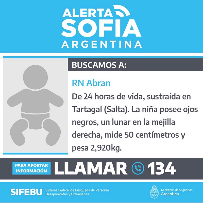 La gerencia del Hospital “Juan Domingo Perón” confirmó el caso de una bebé desaparecida esta mañana del sector de Maternidad; alrededor de las 7 horas; según denunciaron ambos padres. De acuerdo a un comunicado oficial, los dos se ausentaron brevemente de habitación y al volver, la bebé no estaba en la cuna. Policía de Salta, Gendarmería Nacional, Fiscalía y el 911 están alertas y en búsqueda, vigilando calles y Ruta 34.