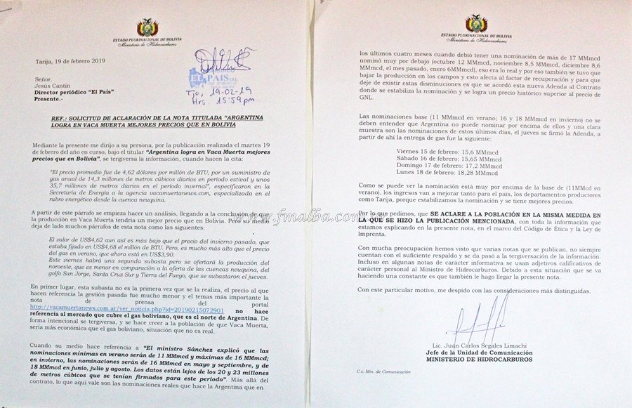 Así lo confirma la Unidad de Comunicación del Ministerio de Hidrocarburos, a cargo de Juan Carlos Segales, en una solicitud de aclaración remitida. En la carta, Segales detalla también las prácticas argentinas del último semestre, en las que a fin de lograr una rebaja de los volúmenes, empezó a nominar por debajo de contrato causando aparentemente daños en el sistema productivo de Bolivia.