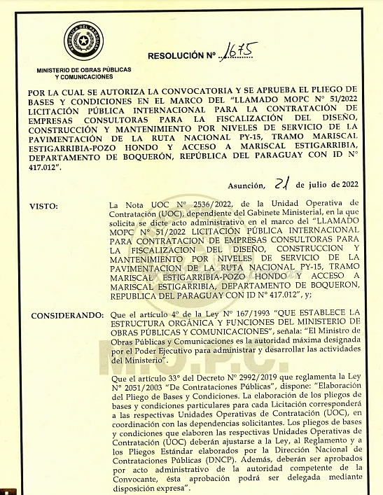 El detalle del documento expone que el llamado al proceso licitatorio “se pone en marcha el proceso para este llamado internacional que se realizará en cuatro lotes. Los documentos ahora serán remitidos a la Dirección Nacional de Contrataciones Públicas (DNCP) para su procesamiento correspondiente”. El ministro de Obras Públicas y Comunicaciones de Paraguay; Arnoldo Wiens; agregó que la obra es financiada por el Banco de Desarrollo (Fonplata).