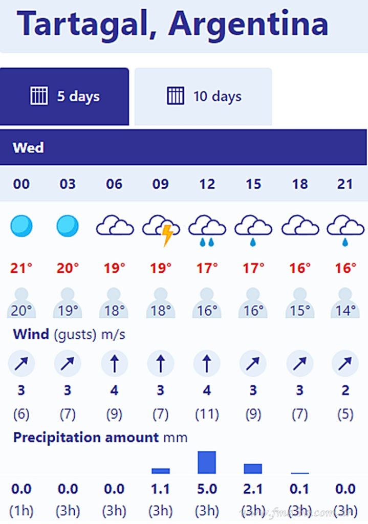 La situación, producto de la rotación del viento al sector sur, permitirá el avance de esta masa de aire frío. Este frente con actividad irregular, producirá lluvias de variada intensidad sobre el centro y el este del país, mientras que hacia el resto del territorio nacional puede observar precipitaciones abundantes a fuertes. Para Tartagal y la zona alrededor se anticipan valores que por debajo de los 10 mm; es decir, registros escasos a nulos.