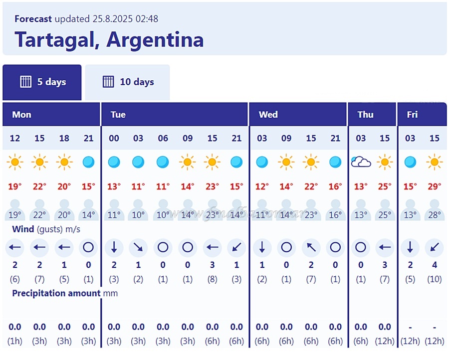 Para Tartagal y la región este de Salta, norte de la región chaqueña y la mayor parte de Paraguay registrará temperaturas mínimas superiores a los 10 grados hasta el miércoles, con un foco con valores superiores a 15 y 20 grados; acompañados por cielos con nubosidad variable a despejados. A partir del miércoles 27, vientos del norte favorecerán a un gradual aumento de las marcas, con mínimas entre 5 y 10 grados, y máximas oscilando entre 25 a 30 grados.