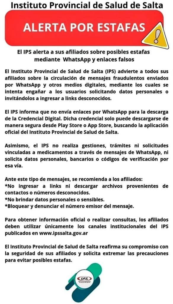 El Instituto Provincial de Salud de Salta (IPS) emitió un comunicado dirigido a sus afiliados y a la comunidad en general, advirtiendo sobre la circulación de mensajes fraudulentos enviados por WhatsApp y otras plataformas digitales. Estos intentos de estafa buscan engañar a los usuarios solicitando datos personales o invitándolos a ingresar en enlaces maliciosos.