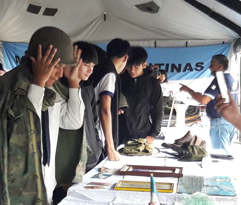El grupo de veteranos llegó desde Salta Capital con la exhibición de objetos, invitados por la Asociación del departamento San Martín, compartiendo también anécdotas de la guerra al público que se acercó a la carpa; entre ellos escuelas y colegios del nivel secundario. “Fue un conflicto de 72 días”, comenzó recordando García, “en el grupo de Salta hay soldados de carrera y colimbas, pero todos ex combatientes”, agregó.