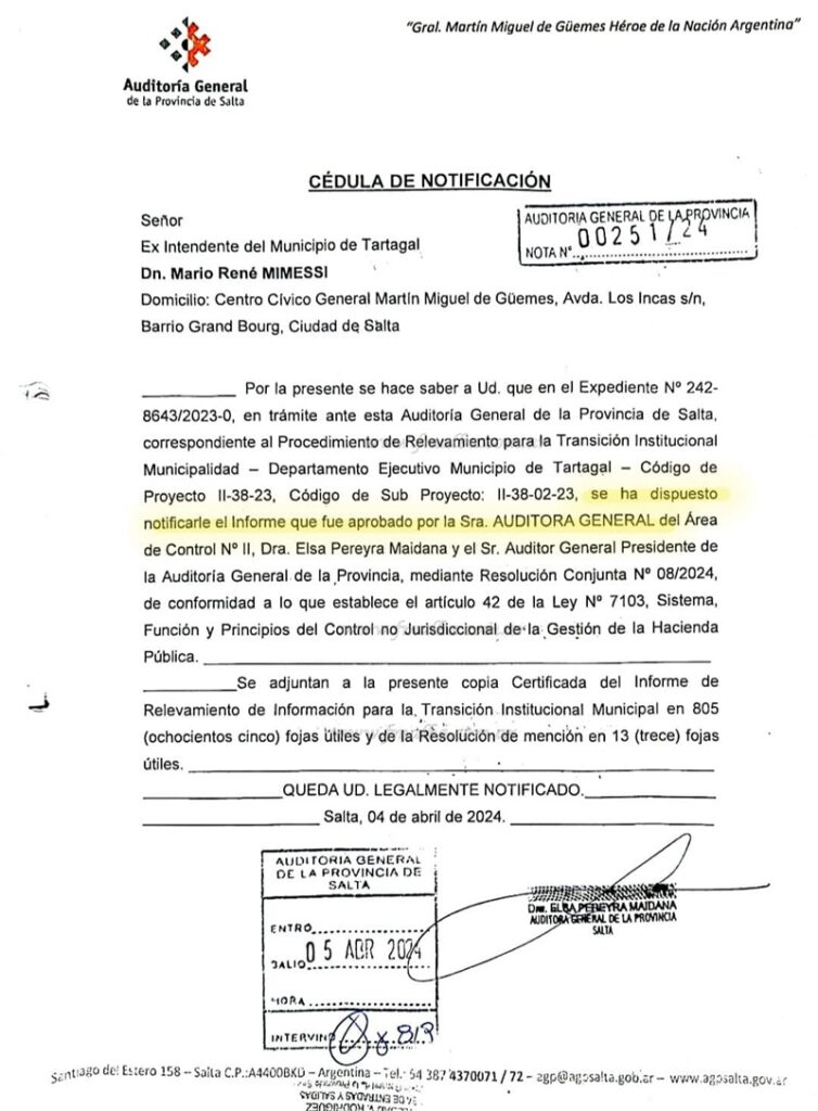Por medio de la resolución conjunta N°8/24, fechada el 8 de marzo de este año, la Auditoría General de Salta notificó que fue aprobado el informe de relevamiento de información de la “Transición Institucional Municipal”; documento donde se deja constancia que toda la documentación del gobierno municipal de Mario Mimessi como intendente de Tartagal fue presentada en tiempo y forma.