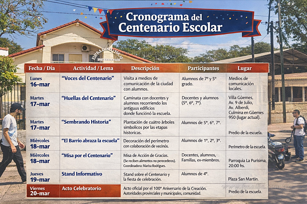 La celebración no se limita al ámbito escolar, sino que busca abrazar a toda la ciudad. Las actividades, que se desarrollan del 16 al 20 de marzo, incluyen desde visitas a medios de comunicación por parte de los alumnos, hasta recorridos históricos por los distintos edificios que albergaron a la escuela en sus inicios, como sus primeras aulas en Villa Güemes. Este sentido de pertenencia se reforzará con la plantación de “árboles del centenario”, simbolizando las etapas históricas de la institución.