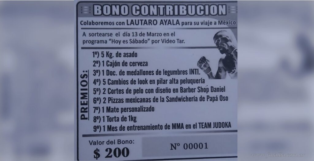 El luchador tartagalense Lautaro “El Judoka” Ayala movió para este fin de semana el sorteo del bingo colaboración mediante el cual reúne fondos para su viaje a Guadalajara; México; invitado a una escuela de formación en disciplinas de MMA, artes marciales mixtas. Los premios fueron donados por casas comerciales de Tartagal, pero también sumó clases gratis en su dojo y recorre personalmente los barrios vendiendo el bono.