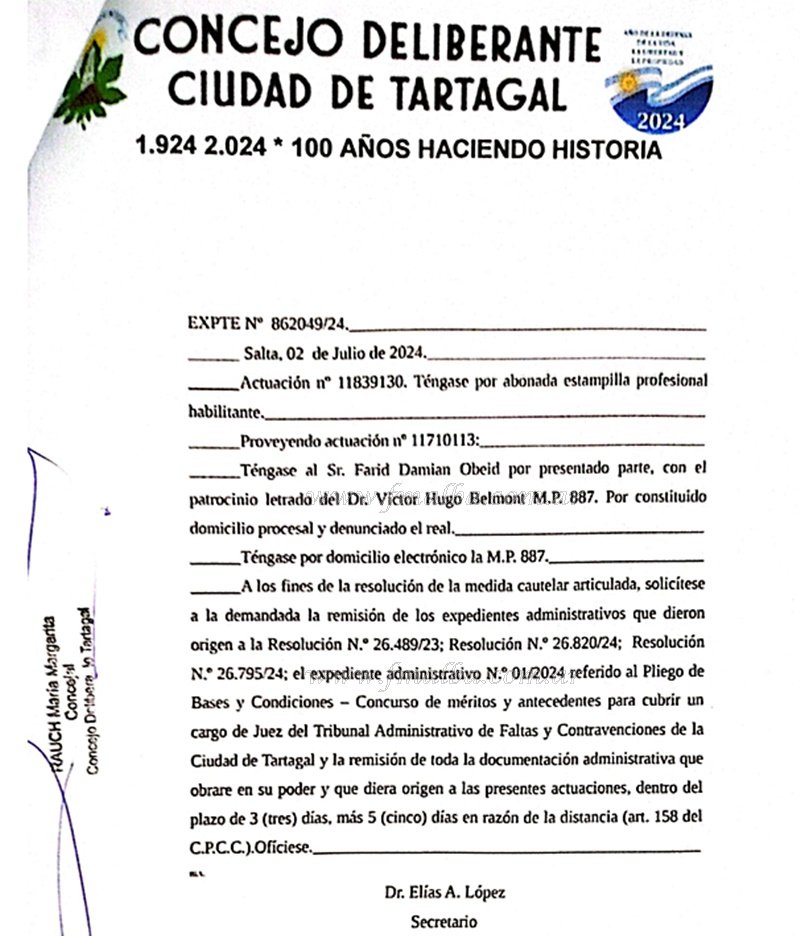 La concejal del bloque radical, Margarita Rauch, convocó al cuerpo de ediles a detener el concurso llamado por la Municipalidad de Tartagal para designar a un nuevo Juez del Tribunal Administrativo de Faltas y Contravenciones; actualmente ocupado por el Dr. Farid Obeid. La legisladora comunal repasó el número de irregularidades del llamado, que desembocó en una presentación judicial por parte de Obeid.