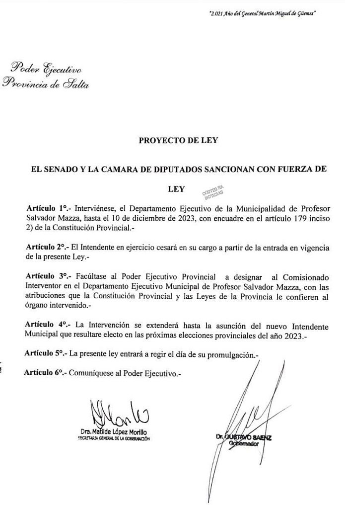 Rubén Méndez había enviado al Concejo Deliberante de Salvador Mazza la petición de licencia; documento que ingresó este jueves por la mañana; pero casi al mismo tiempo ingresaba al Senado de Salta el proyecto de intervención a la comuna. Los legisladores citaron al ministro de Gobierno, Ricardo Villada, para fundamentar las razones por las cuales el Poder Ejecutivo Provincial presentaba dicho Proyecto de Ley. Del encuentro participaron el vicegobernador Antonio Marocco (presidente del cuerpo) y senadores de todas las bancadas.