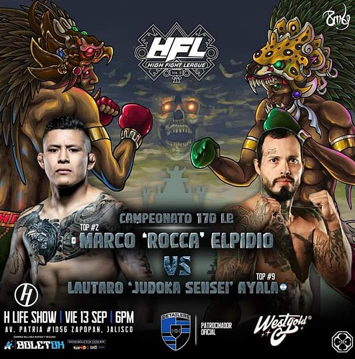 En Jalisco (México), “Judoka Sensei” (Argentina); actualmente N°9 en el ranking de la HFL, enfrenta a Marco “Rocca” Elpidio (México) por el campeonato 170 LB en Welterweight este viernes 13 de septiembre (18 Hora México). Ayala ostenta un récord general de 9-10-0 en MMA y con HFL 2-2.