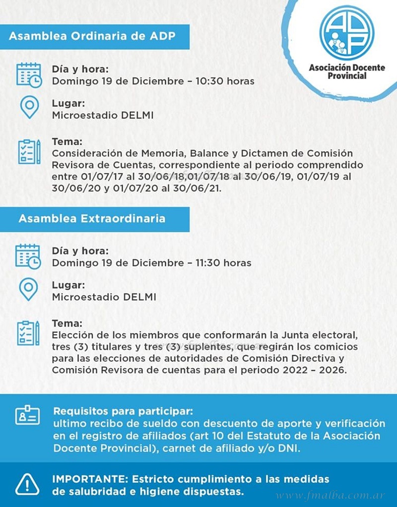 Ahora, ADP dispone de cinco días para definir una nueva fecha para la Asamblea por Memoria y Balance; no así para la extraordinaria (11.30 horas del sábado 19 de diciembre) que definirá a los integrantes de la Junta Electoral, quienes a su vez definirán el cronograma electoral de la Asociación. También deberá dotar de los padrones a las listas que irán a los comicios y entregar la Memoria, Balance General y Dictamen de Comisión Revisora de Cuentas de los cuatro períodos con una anticipación no inferior a 20 días corridos previos a la Asamblea.