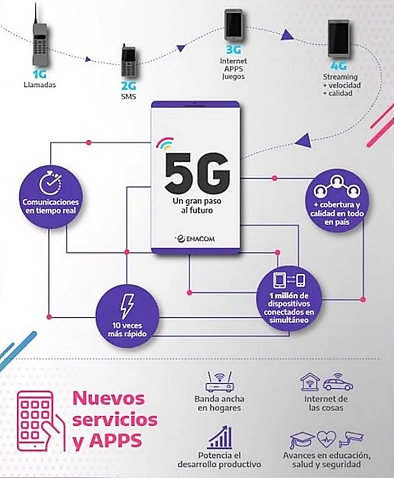 Actualmente, en Argentina operan redes hasta 4G Long Term Evolution (LTE). Enacom estima que las redes 5G permitirán incrementar el rendimiento de servicios basados en la nube, así como el streaming de video en 4k, 8k y 3D, experiencias de realidad virtual y juego bajo demanda conforman algunas de las aplicaciones diarias.