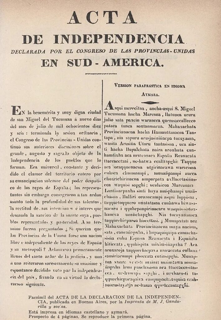 El acta se publicó en español, en quechua y aymará, incorporando a los pueblos originarios para que todos supieran lo que pasó el 9 de julio de 1816. Declara así la voluntad de las Provincias Unidas de romper los vínculos con España y cualquier dominación extranjera. Los diputados afirmaron el derecho a ser una nación libre e independiente del rey Fernando VII, sus sucesores y metrópoli, y cualquier otra potencia extranjera; como ya había quedado manifiesto tras la incursión de la Corona Británica y las frustradas invasiones.