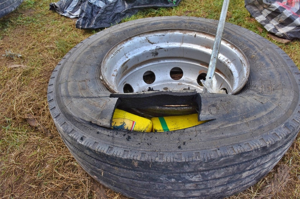 Una de las inspecciones tuvo lugar en una finca ubicada sobre la Ruta Nacional N° 34, de la localidad de General Mosconi. Allí, dentro de una gomería abandonada, los gendarmes hallaron 400 paquetes rectangulares acondicionados dentro de siete cubiertas de camión. Las pruebas de Campo Narcotest realizadas por personal de Criminalística y Estudios Forenses confirmaron que se trataba de cocaína, con un peso total de 425 kilos 975 gramos.