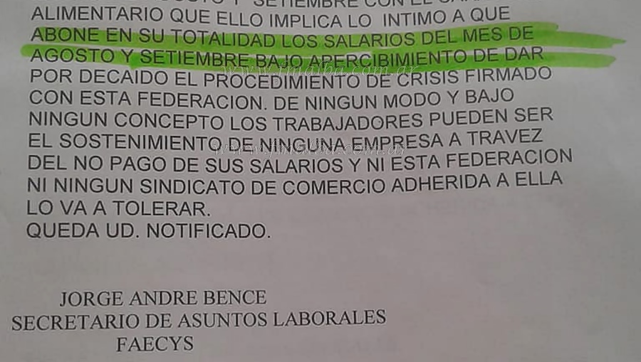 Más adelante, señalan “lo intimo a que abone en su totalidad los salarios del mes de agosto y septiembre bajo el apercibimiento de dar por decaído el procedimiento de crisis firmado con esta Federación. De ningún modo y bajo ningún concepto los trabajadores pueden ser el sostenimiento de ninguna empresa a través del no pago de sus salarios y ni esta Federación ni ningun Sindicato de Comercio adherida a ella lo va a tolerar”.