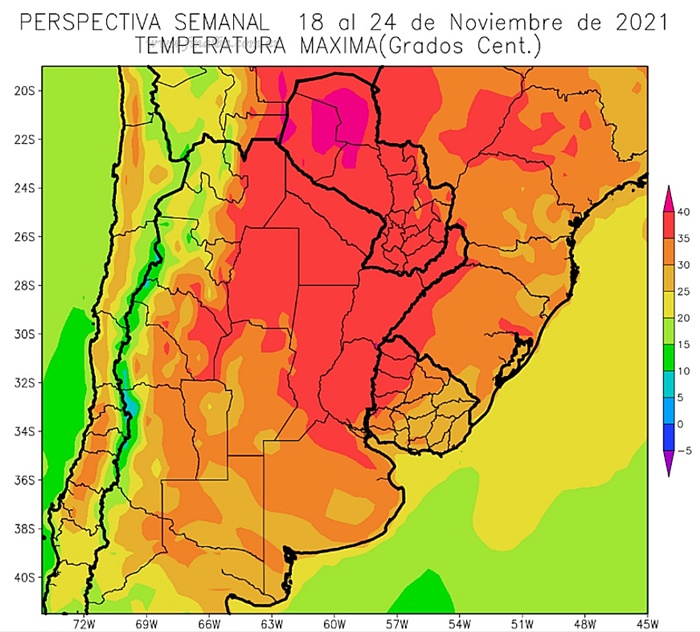 Un segundo informe adelanta que desde este jueves 18, retornará el calor a la región norte, acompañado por precipitaciones de variada intensidad en el centro y este del país, para cerrar Noviembre con un nuevo descenso de temperaturas. Para el NEA-NOA se esperan marcas del orden superior a los 35 grados, con focos puntuales por arriba de los 40 grados el límite noroeste con Paraguay. Los valores máximos se vivirán durante el fin de semana largo por el Día de la Soberanía. A la vez, ocurrirá el paso de un frente de tormentas; situación que registrará valores escasos en la región, de entre 10 a 20 mm.