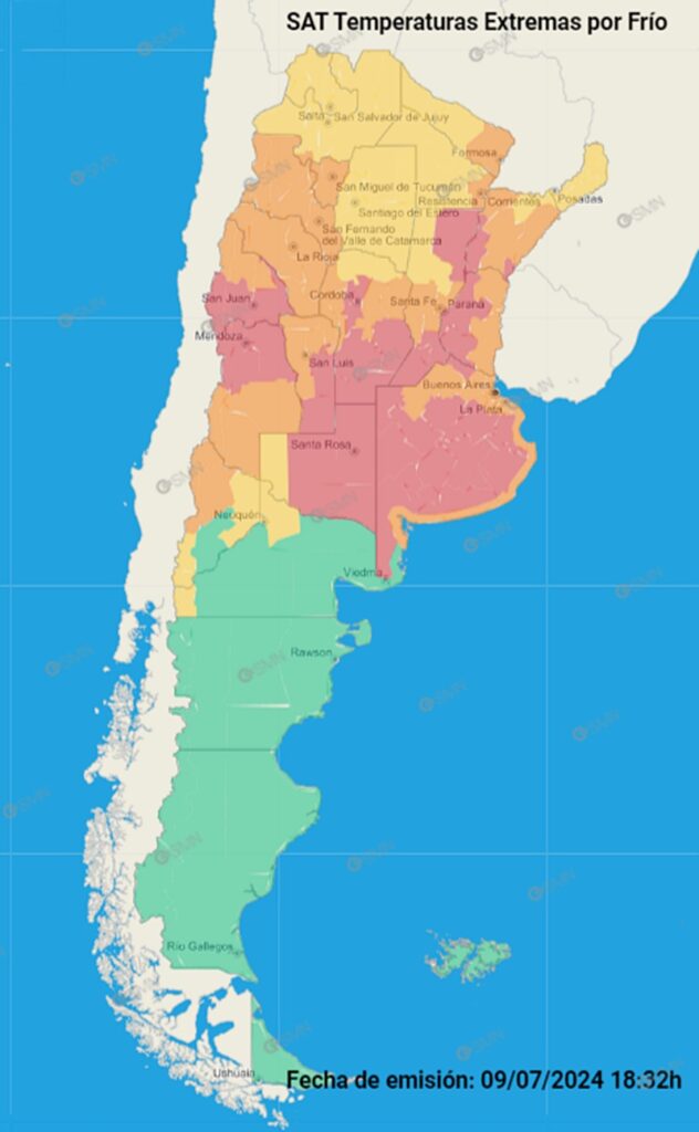 El Servicio Meteorológico Nacional extendió alertas amarillas por bajas temperaturas para los departamentos Iruya, Santa Victoria Este, Orán y San Martín este martes 9 de Julio por la tarde. Las temperaturas extremadamente bajas van a continuar durante varias jornadas más, completa, afectando a todo el territorio nacional pero particularmente a la región central, marcada por los bajos valores.