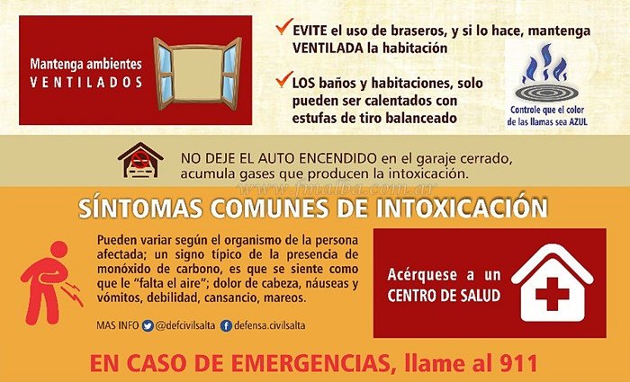 Defensa Civil Salta llamó a la comunidad en general a tomar precauciones para evitar intoxicaciones con dióxido de carbono, ante la anunciada llegada de ola polar a partir de este miércoles sobre la región norte. Sobre todo se hizo incapié en evitar el uso de braseros en ambientes cerrados y calefaccionar con estufas de tiro balanceado.