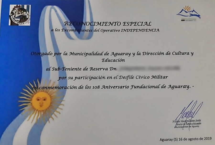 Finalmente, Aguaray los recibió el viernes 16 en su desfile por los 108 años del pueblo. El intendente Alfredo Darouiche otorgó un Reconocimiento Especial a cada uno de los ex combatientes del Operativo Independencia que se sumaron a los festejos del pueblo.