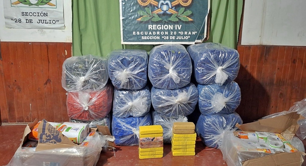 Tras inspeccionar los bultos, los funcionarios hallaron 16 paquetes con la droga y otros con la mercadería ilegal.