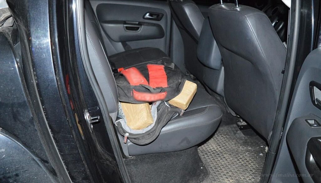 Luego de un seguimiento controlado, los funcionarios interceptaron a la camioneta cuando ingresaba en una estación de servicio, donde colisionó a un camión con acoplado que se encontraba estacionado. Al registrar ambos vehículos, hallaron dentro de la camioneta una mochila que contenía seis paquetes rectangulares.