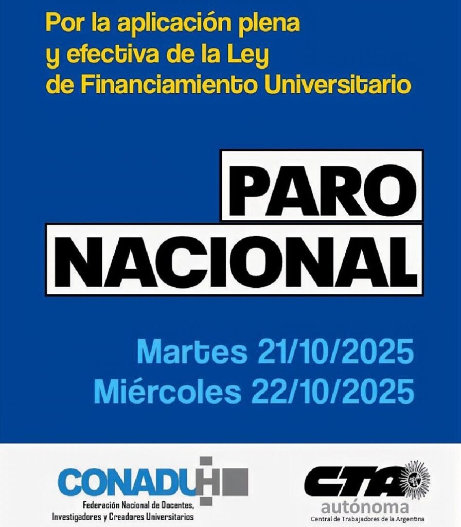 El sector universitario determinó paro de 48 horas para este martes 21 y miércoles 22 de octubre, convocado por la Federación Nacional de Docentes Universitarios (Conadu) y la de los no docentes nucleados en FATUN, en línea con la propuesta de Conadu Histórica. La medida responde a la dilación del Poder Ejecutivo de promulgar y ejecutar la Ley Nº 27.795, de Financiamiento de la Educación Universitaria y Recomposición del Salario.