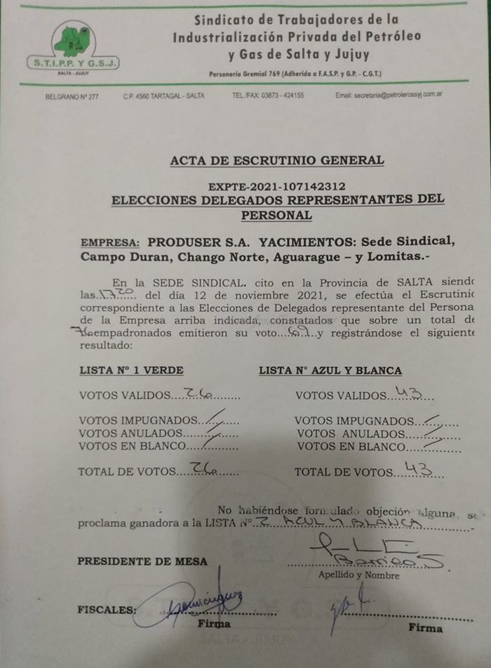 La Lista “Azul y Blanca” se impuso por 17 votos a la Lista “Verde” en la elección para Delegados Representantes del personal del Sindicato de la Industria del Petróleo y Gas Privado de Salta y Jujuy. La lista ganadora se componía por la dupla Walter Domínguez-Fabián Tossolini. Resta ahora llevar a cabo las elecciones para Secretario General y Comisión Directiva este 2 de diciembre.