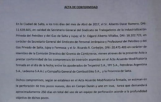No obstante, con la marcha convocada, el secretario general del Sindicato hizo pública el acta de conformidad que se firmó con las empresas Tecpetrol, YPF, Petrobras Argentina SA, Ledesma SAAI, Compañía General de Combustibles y el Gobierno de Salta, acordando la perforación de tres pozos; dos en Campo Durán y uno en Icua (área cercana a Tonono y Puesto de Alcoba).
