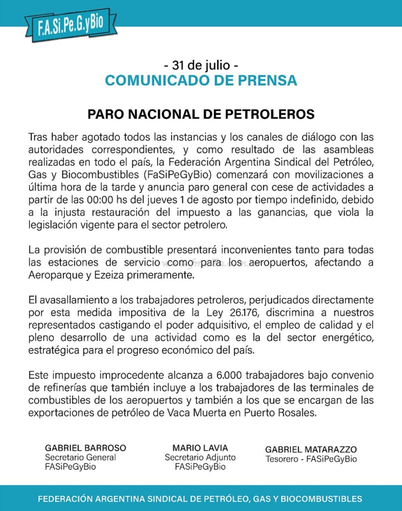 La Federación Argentina Sindical del Petróleo, Gas y Biocombustibles llamó un paro por tiempo indeterminado a partir de este jueves 1 de Agosto, en rechazo al pago del Impuesto a las Ganancias, medida que afecta a petroleros bajo el Convenio Colectivo de Trabajo 449 de refinerías y depósitos de combustibles. Es decir, afecta la refinación y al transporte desde las instalaciones de naftas y gasoil por camiones, alcanzando también a embarcaciones y aeropuertos como Aeroparque y Ezeiza.