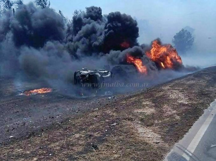 Al caer, explotó la carga, que milagrosamente no alcanzó al chofer (que pudo escapar) pero sí consumió a todo el vehículo