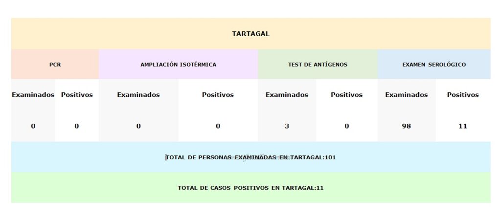En la ciudad de Tartagal, habiendo recorrido ya barrios de zona sur y este, los datos al momento correspondientes al lapso de tiempo entre el 9 y el 14 de noviembre arrojan 11 positivos detectados mediante el examen serológico: