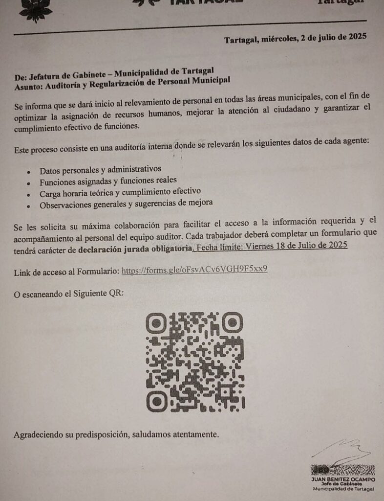 La Jefatura de Gabinete de la Municipalidad de Tartagal informó que auditarán al personal a fin de regularizar la situación de cada uno, en medio de la polémica por despidos de trabajadores con la antigüedad requerida para contratos y denuncias por intimidaciones y maltratos de funcionarios. El comunicado se difundió el miércoles 2 de julio y tiene como plazo el 18 de julio para presentarse, bajo calidad de “declaración jurada”.