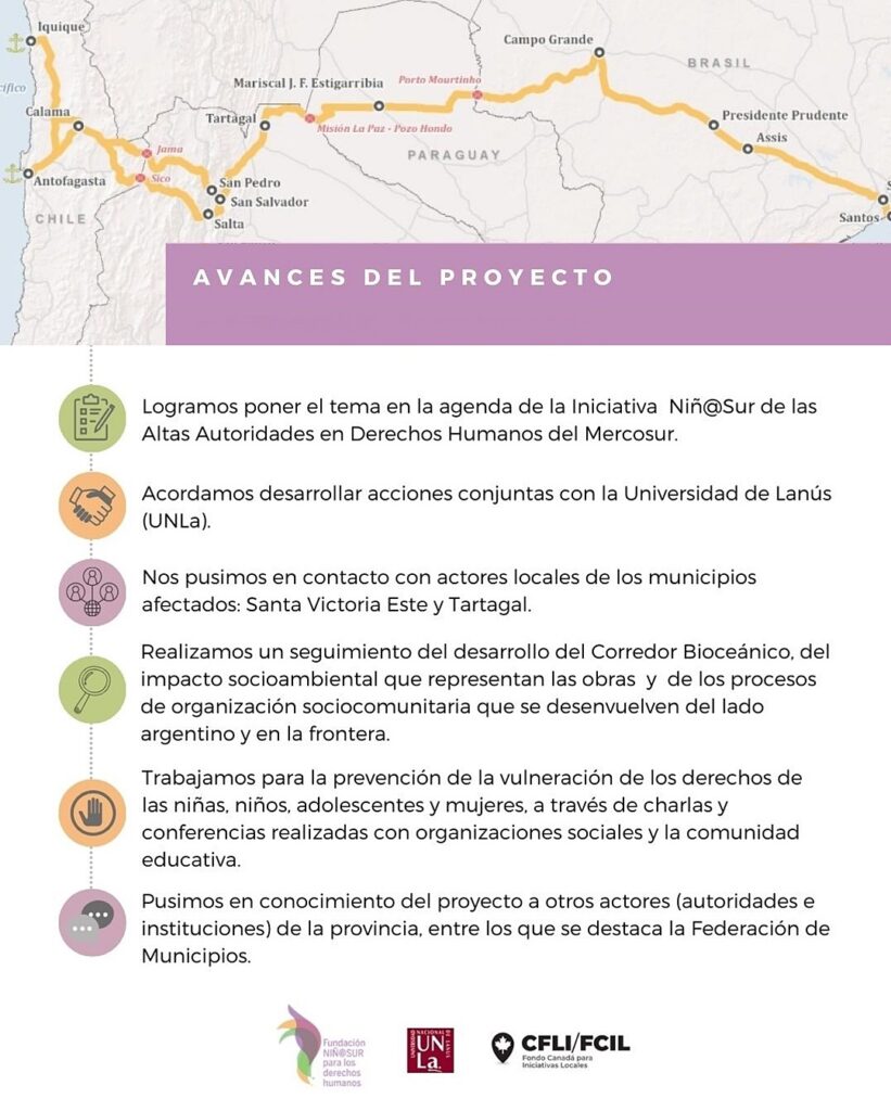 La Fundación Niñ@Sur, la Universidad Nacional de Lanús y el Fondo Canadá para Iniciativas Locales, con la municipalidad, presentaron la campaña de prevención de trata de personas en la zona del Corredor Vial Bioceánico en el Centro Cultural de los Pueblos Originarios de Tartagal. En el norte, se enfoca en Santa Victoria Este y Tartagal.