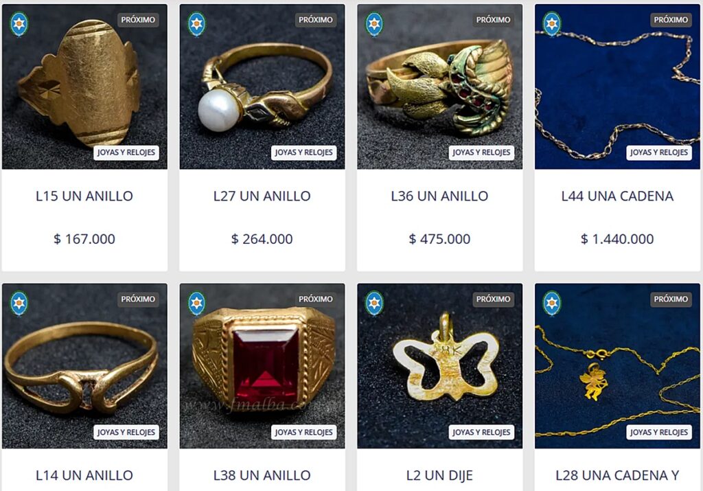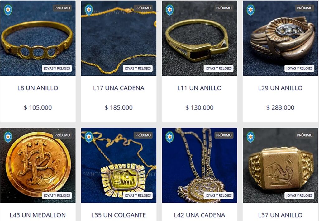 Entre las piezas más destacadas, se encuentran un reloj de oro de 18 quilates con un peso de 30,7 gramos y una pulsera de oro macizo de 18 quilates de 30 gramos; y además se incluye una variedad de valiosas alhajas, como dijes y cruces de oro, anillos de plata y una moneda antigua de plata. También se incorporan 14 lotes de bienes varios: un juego de sillones, un equipo electrógeno y un proyector.