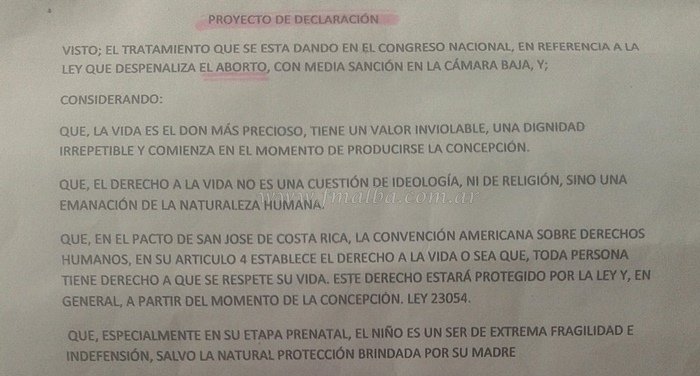 En el artículo 1 del proyecto es donde se lee que “el Concejo Deliberante de Aguaray se manifiesta a favor de la vida e insta para que todas las instituciones con poder de decisión viabilicen para encontrar una solución alternativa de manera tal que el amparo a las madres y los niños sea cada vez más amplio en el ámbito de los organismos responsables de la protección y el servicio a la salud y la vida”.
