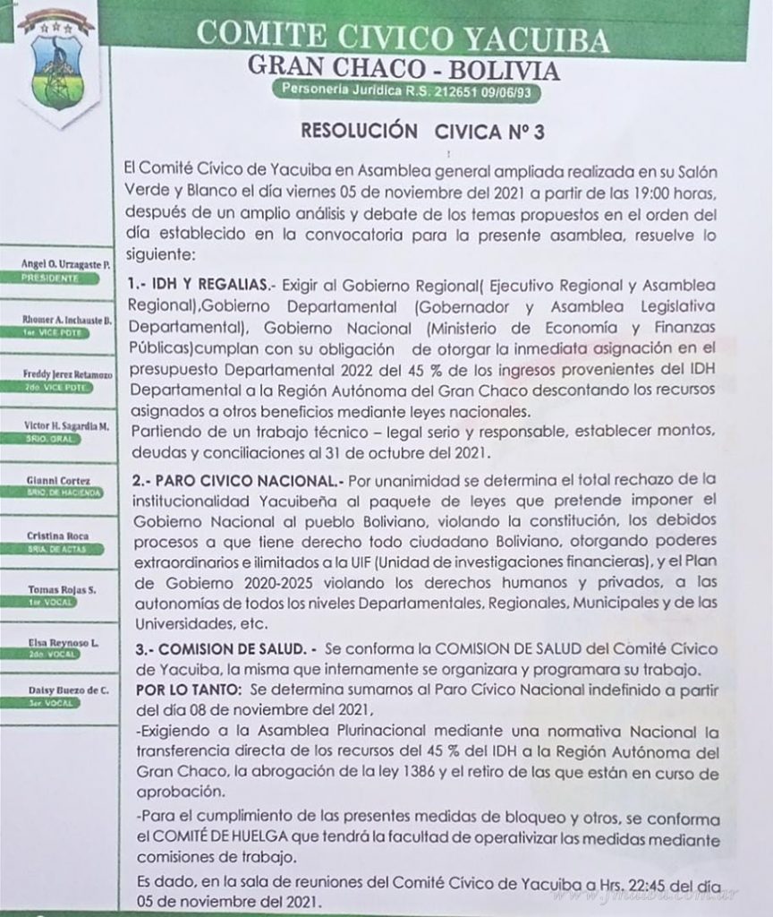 La medida de fuerza en el Puente tenía planificado iniciar (y continuar) con un bloqueo, mismo que se preveía apoyado por lo miembros del Transporte Internacional; para luego incorporar otros puntos de cierre. La decisión de los cortes se aprobó en una asamblea general realizada el viernes 5 de noviembre por la noche. En ella se analizaron varios temas, aparte del paro nacional indefinido, se trataron los problemas por el personal de salud que afronta la Región del Chaco y la conciliación de cuentas en torno a las regalías y el IDH (Índice de Desarrollo Humano). (El País.bo/El Chaco Informa/El Gran Chaco)
