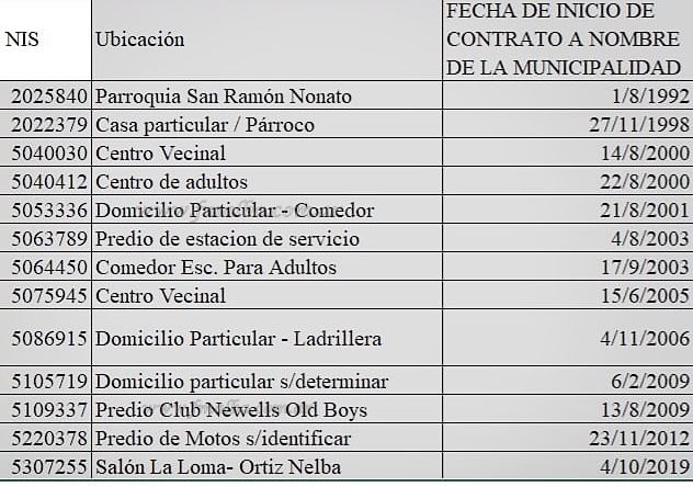 Al mismo tiempo, circuló una planilla donde figuran algunos de los destinatarios del servicio social, figurando Parroquia San Ramón Nonato (1 de agosto de 1992), un particular que identifica como “Párroco” (27 de noviembre de 1998), un centro vecinal (no especifica nombre o ubicación – 14 de agosto de 2000) y entre los últimos, del año 2009, un domicilio particular (“s/determinar”) y el predio del Club Newells Old Boys (13 de agosto de 2009). El último que se lee es el Salón La Loma, propiedad de Nelba Ortiz (4 de octubre de 2019); año en que el actual intendente Franco Hernández Berni desempeñaba como secretario de gobierno de la gestión interina de Eduardo Leavy.