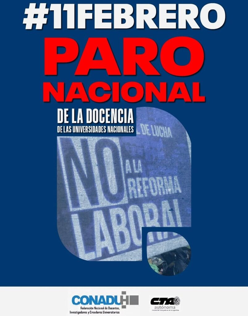 Este miércoles 11 de febrero, por convocatoria de Conadu Histórica, universidades nacionales llevan a cabo un paro de 24 horas en contra de la reforma laboral y en reclamo por el cumplimiento de la Ley de Financiamiento Universitario. La medida se decidió el pasado 6, en el Plenario de Secretarías Generales del gremio. En Tartagal, sumó la adhesión de la Facultad Regional de la UNSa.