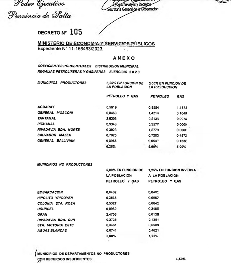 El texto del Decreto 105/2023 se publicó el 19 de diciembre del año pasado y aplicaba vigencia desde el 1 de enero hasta el 31 de diciembre de dicho año, fijando los porcentajes de distribución de Ingresos por Regalías Petrolíferas y Gasíferas divididas entre municipios productores y no productores de los departamentos Rivadavia, Orán y San Martín. En el primer grupo se encuentran Salvador Mazza, Aguaray, Tartagal, General Mosconi, General Ballivián, Pichanal (Orán) y Rivadavia Banda Norte (Rivadavia).