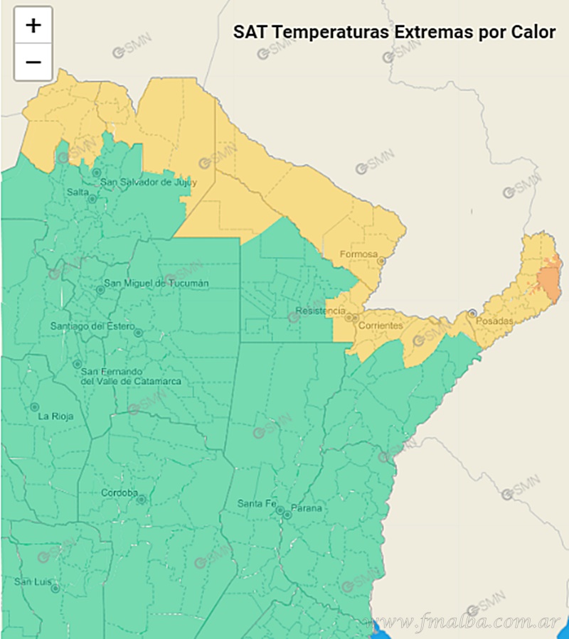 El Servicio Meteorológico Nacional emitió un alerta amarillo para la región norte de Argentina, abarcando la zona este de Salta y Santiago del Estero, la totalidad de Formosa, Chaco y Misiones, y la zona norte de Corrientes y Santa Fe. Se estiman marcas de 40 grados, por lo que se recomienda resguardar a la población de riesgo; niños, mayores de 65 años, y aquellas con enfermedades crónicas.