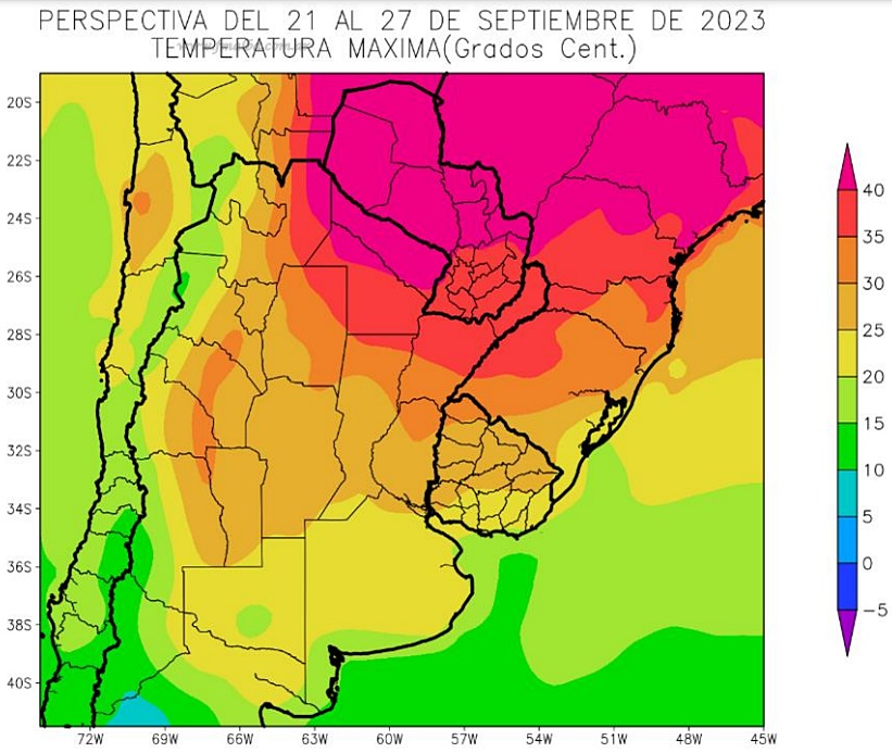 Con el equinoccio de Primavera este sábado 23 de septiembre, el fin de semana transitará bajo intenso calor en la región norte del país. A inicios de la semana próxima, entre lunes y martes, iniciará el paso de un frente de tormenta, que producirá lluvias ligeras y con este frente arribará una masa de aire polar que provocará el descenso general de la temperatura, con heladas locales y generales en la zona cuyana y provincia de Buenos Aires.
