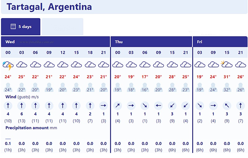La irregular actividad de lluvias, en tanto, seguirá con foco de lluvias moderadas a abundantes sobre las áreas vecinas del Brasil. La región de Tartagal y región alrededor recibirá aportes escasos a nulos. El SMN estima que los valores de precipitaciones pueden oscilar entre moderadas (10 mm o más) en el nordeste del NOA, y abundantes hacia el litoral (más de 25 mm).