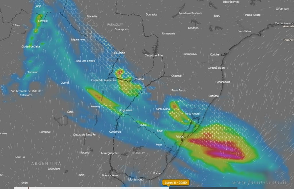 Hacia la región centro y oeste de Salta (al igual que la provincia de Jujuy) las marcas descenderán por debajo de los 5 grados y tocarán registros por debajo de 0 grados, dando lugar a heladas generalizadas. El frente de tormentas también tocará a esta región, ya que abarcará a toda la franja de provincias del noroeste (focos de 50 mm en Formosa, Santa Fe, Corrientes y Misiones); mientras que hacia el sur del país provocará nevadas sobre el total de la Cordillera.