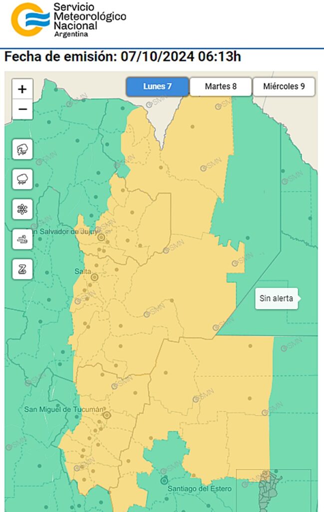 El alerta emitido por el SMN para Tartagal y la región está reducido para las horas nocturnas de este lunes 7, y anticipa tormentas de variada intensidad (que ya en horas de la tarde tocaban a Salta Capital), algunas localmente fuertes, acompañadas principalmente por abundante caída de agua en cortos períodos, intensa actividad eléctrica, ocasional caída de granizo y fuertes ráfagas de viento. Los valores de precipitación acumulada estimada oscilan entre 30 y 55 mm, pudiendo ser superados de forma local.