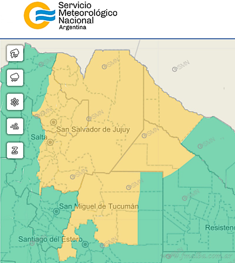 El Servicio Meteorológico Nacional emitió alerta amarilla para toda la región centro-este de Salta por tormentas intensas. Para los departamentos Orán, Iruya, Santa Victoria Este y San Martín se anuncian tormentas con registros de entre 40 y 60 mm, además de intensa actividad eléctrica, ocasional caída de granizo, y abundante caída de agua en cortos períodos de tiempo.